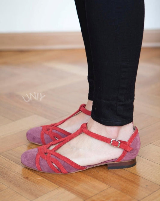 Color Block Faux Suede Pointed Toe Stylish T-Strap Flats [Pre Order]