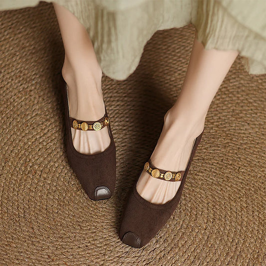 Metal Coin Chain Decor Instep Strap Patchwork Square Toe Chunky Heels