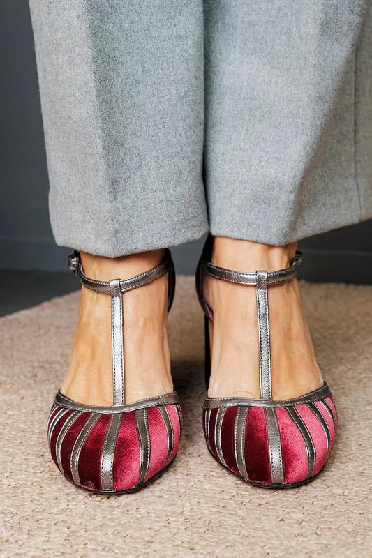 Colorblock T-Strap Buckle Velvet Round Toe Red Chunky Heels [Pre Order]