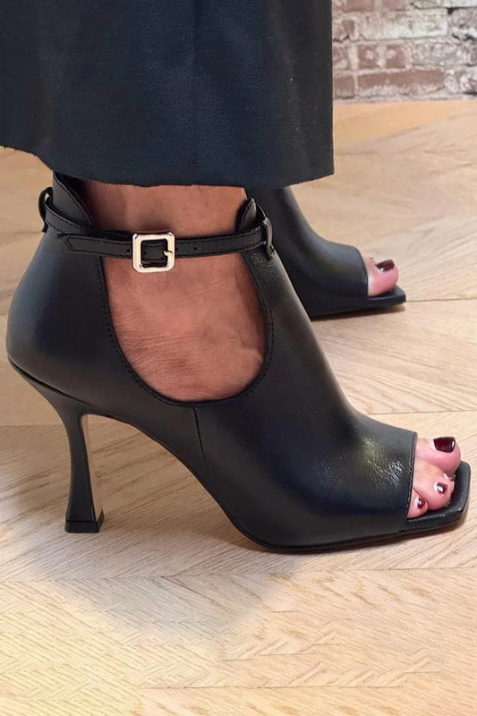 Cut Out Square Toe Buckle Ankle Strap Black Stiletto Heels [Pre Order]