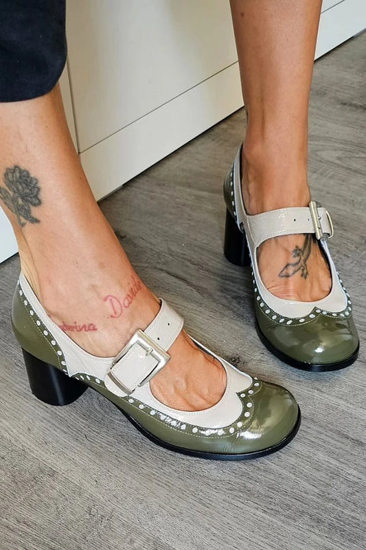 Exquisite Instep Strap Buckle Colorblock Round Toe Green Chunky Heels [Pre Order]
