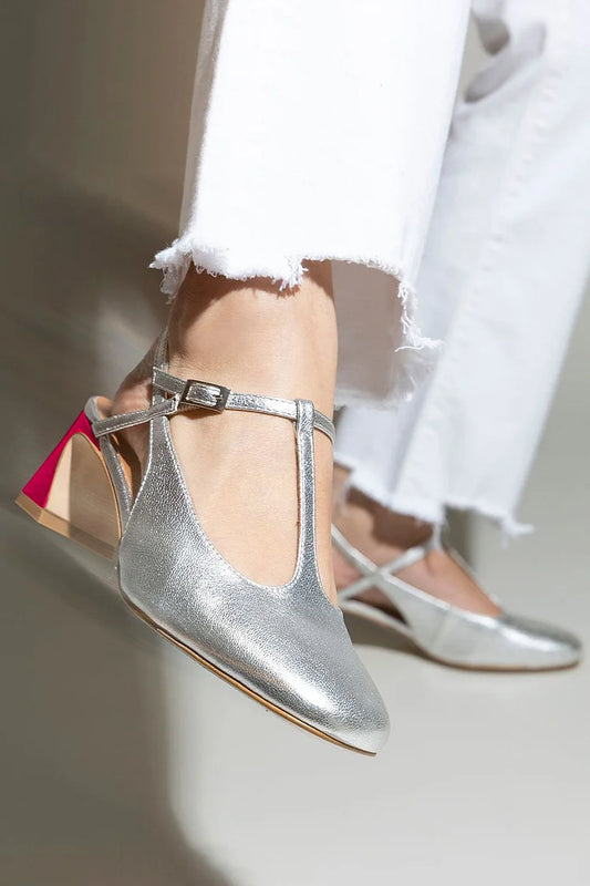 T-strap Buckle Square Toe Chunky Silver Colorblock Heels [Pre Order]