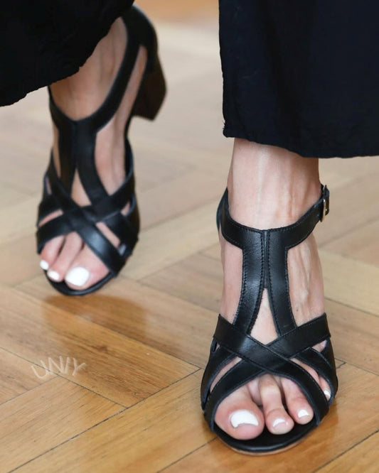 Black Leather Cross Strap T-Bar Block Heels Casual Sandals [Pre Order]