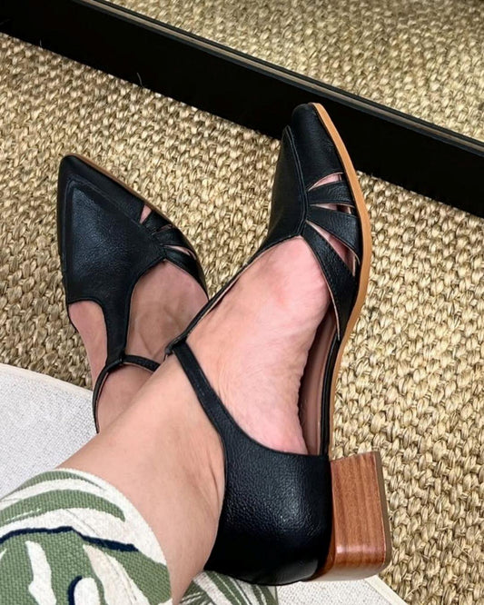 Black Cutout Pointed Toe T-Strap Versatile Low Block Heels [Pre Order]
