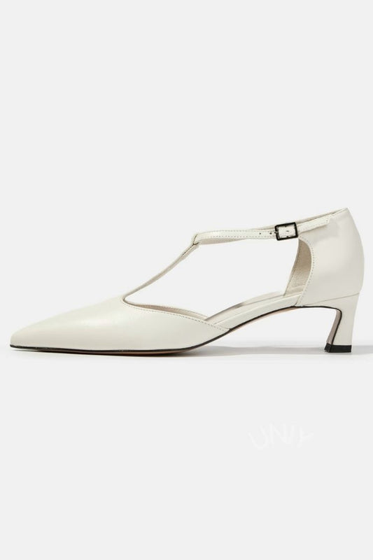 Chic White Leather Pointed Toe T-Strap Kitten Heel Pumps [Pre Order]