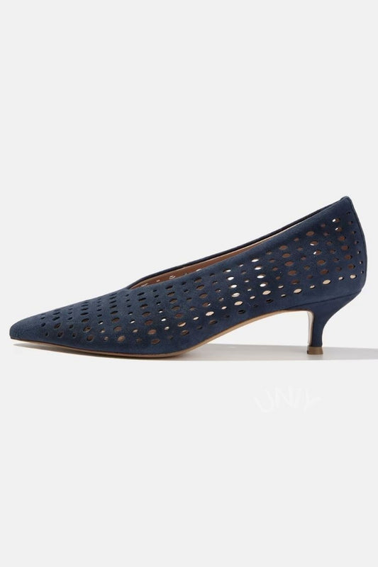 Chic Navy Blue Perforated Pointed Toe Kitten Heels [Pre Order]