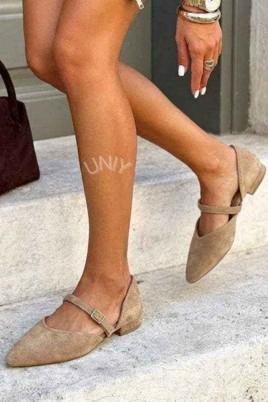 Chic Beige Pointed Toe Faux Suede Strap Flats [Pre Order]