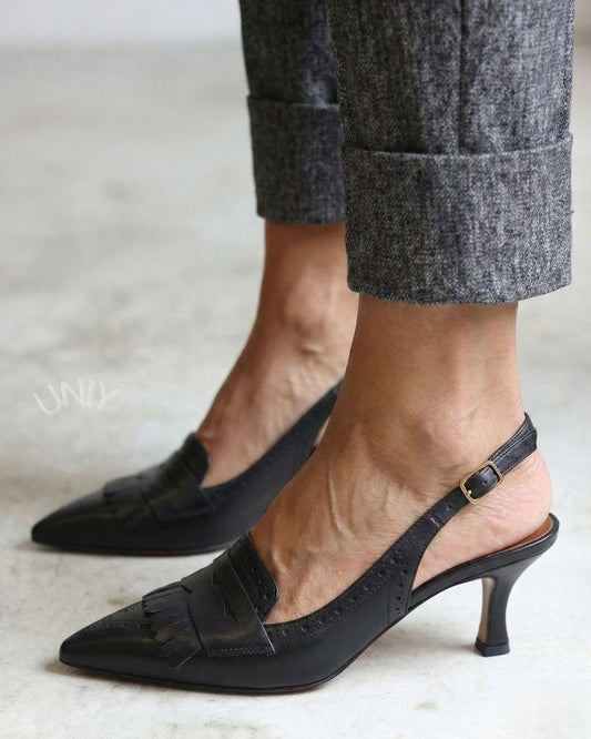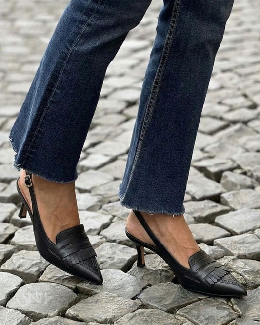 Sorte spidse snøresko med frynser, slingback og lav hæl [Forudbestilling]