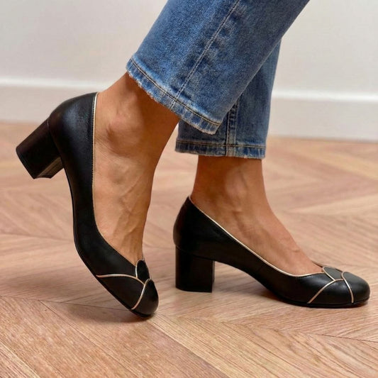 Elegant sort guldbeklædning detalje rund tå blok hæle [Forudbestilling]