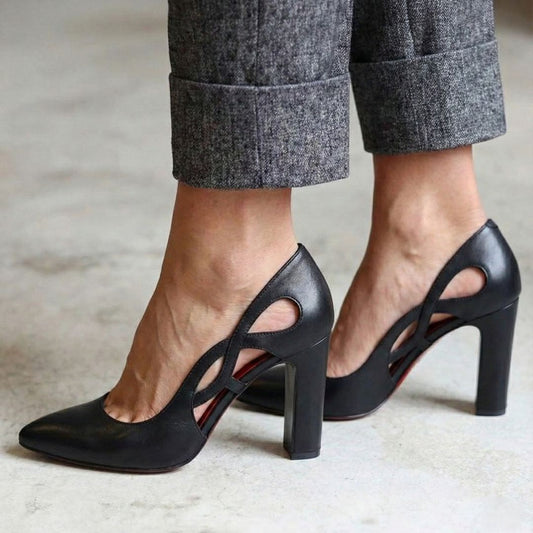 Elegant sort spids tå med udskæringsdesign og høje blokhæle [Forudbestilling]