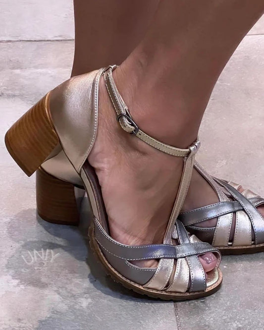 Sølvmetallic krydsrem T-strop blokhæl sommersandaler [Forudbestilling]