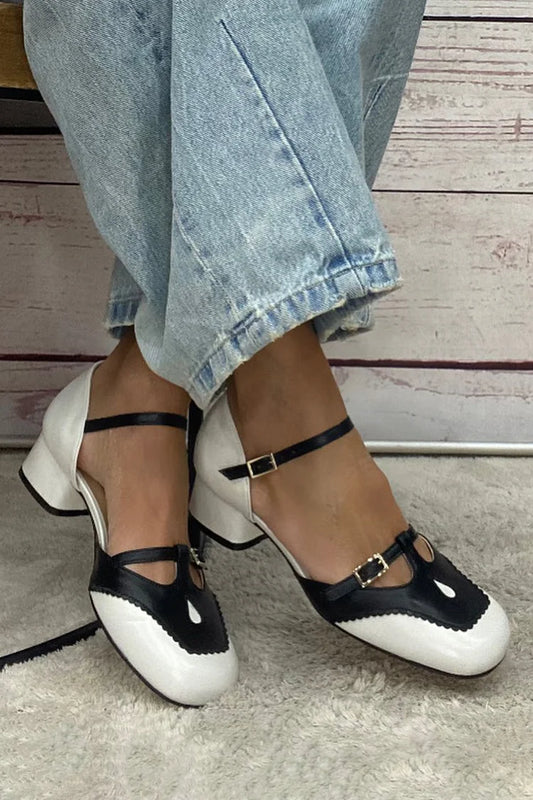 Colorblock-Riemenschnalle Rundspitze Weiße Niedrige Absätze [Vorbestellung]