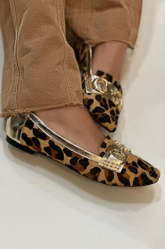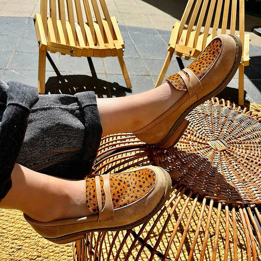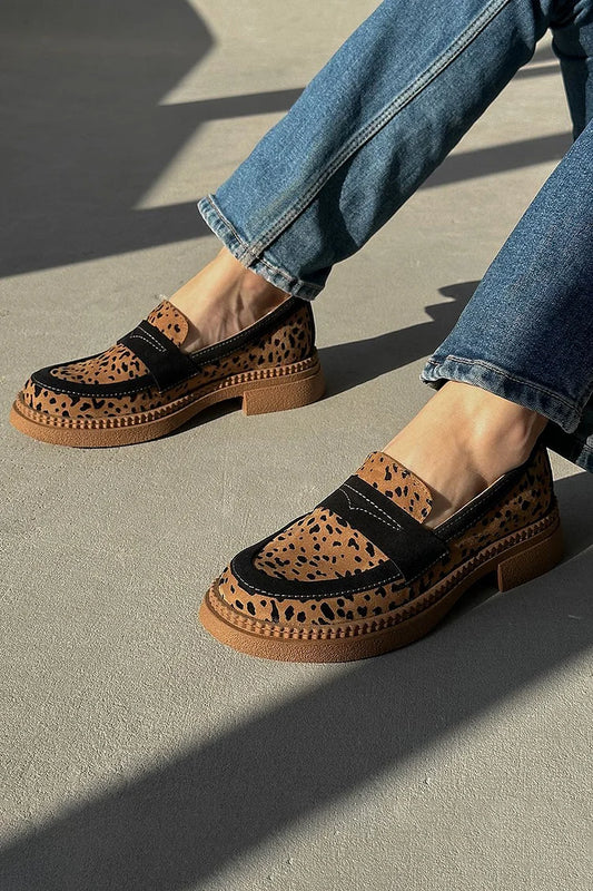 Gefütterte Loafers mit Leopardenmuster, Patchwork, rundem Zehenbereich, hellbraun [Vorbestellung]