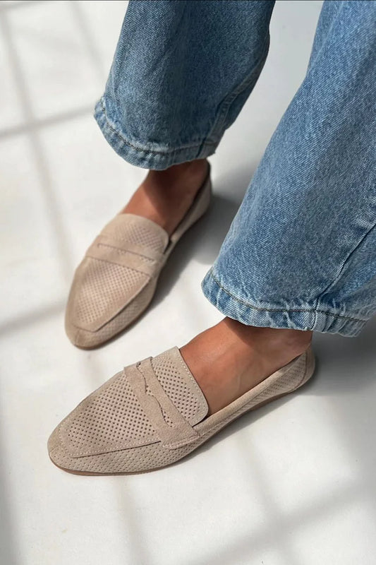 Stilvolle Patchwork Einfarbige Ausgehöhlte Runde Zehen Beige Loafer [Vorbestellung]