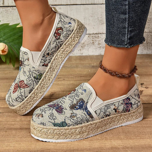 Lässige, gewebte Plateau-Slipper aus Segeltuch mit Musterdruck und runder Zehenpartie