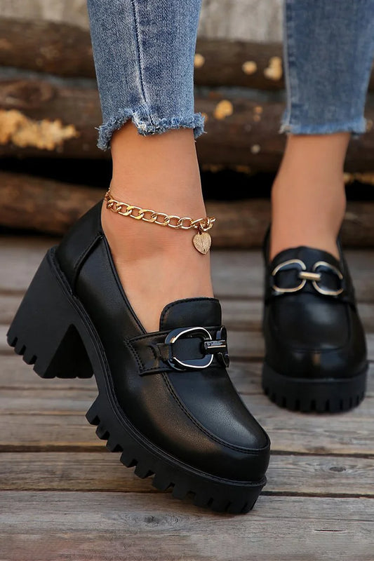 Patchwork-Loafer mit runder Zehenpartie und Metallschnallendekor und klobigem Absatz