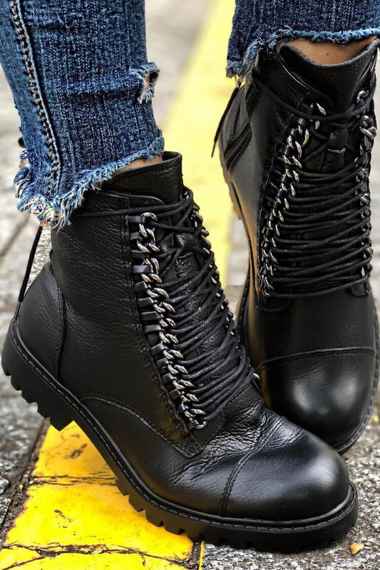 Schwarze Schnürstiefeletten aus Leder mit Kettendetail [Pre Order]