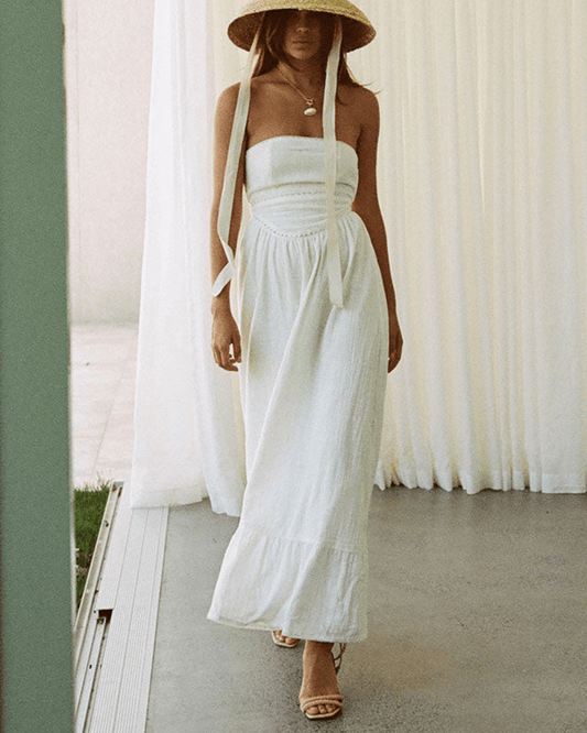 Fließendes Boho-Maxikleid mit gesmokten Rüschen und Spaghettiträgern und U-Ausschnitt