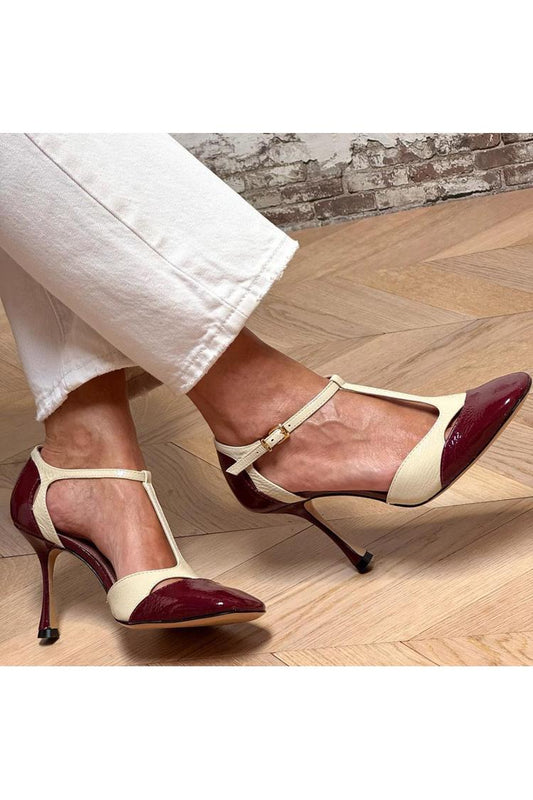 Zweifarbige T-Riemen Cut-Out Schnalle Burgunder Stiletto Absätze [Vorbestellung]
