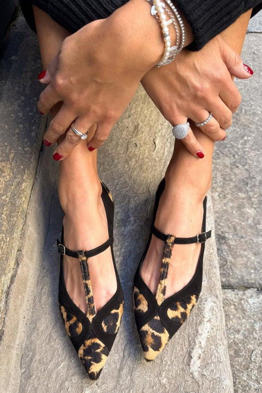Leopardenmuster T-förmiger Spannriemen Spitz zulaufende Zehen Schwarze Ballerinas [Vorbestellung]