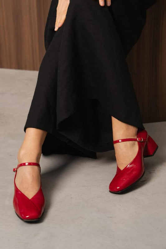 Kontrast Lackleder T-Riemen Quadratische Spitze Rote Klobige Absätze [Vorbestellung]