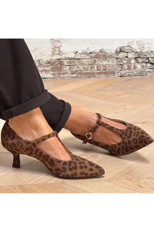 T-Riemen Schnalle Leopardenmuster Spitz zulaufende Zehen Braune Kittenabsätze [Vorbestellung]