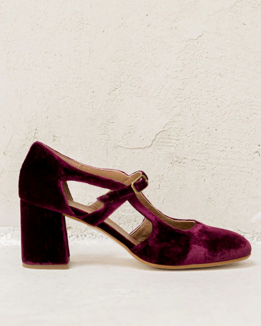 Elegante burgunderrote Samt-Sandaletten mit Knöchelriemen, Cutout und Blockabsatz [Vorbestellung]