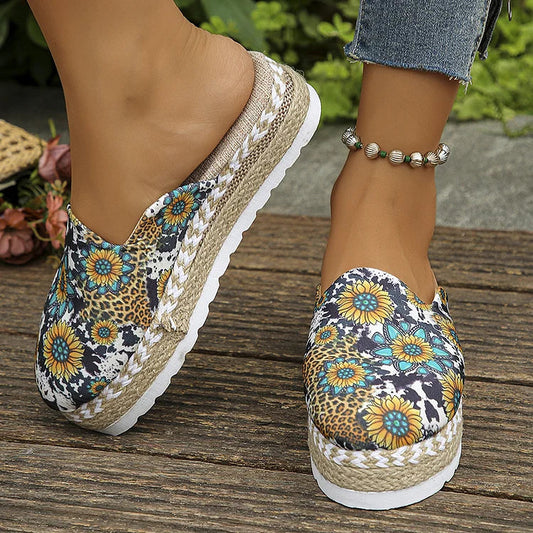 Espadrille-Plateaupantoffeln mit geschlossenem Zehenbereich und Sonnenblumenmuster