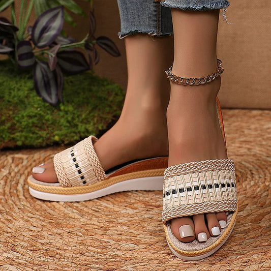 Lässige Peep-Toe-Hausschuhe mit gewebtem Muster und kariertem Keilabsatz