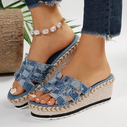Patchwork-Druck ausgehöhlte Peep-Toe-Jeans-Slipper mit ausgefranstem Keilabsatz