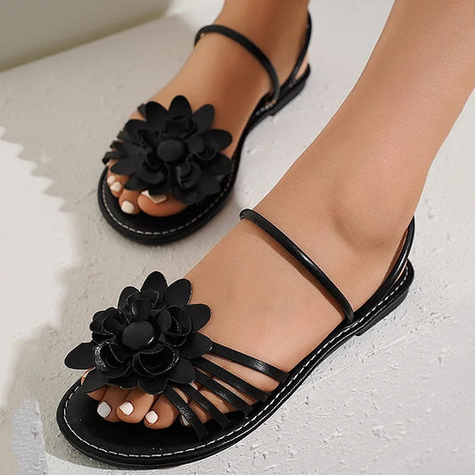 Lässige, schlichte, ausgehöhlte Riemchensandalen mit 3D-Blumen-Strasssteinen