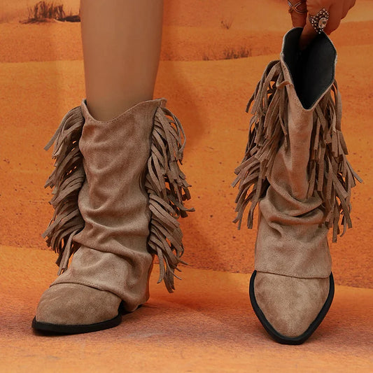 Einfarbige, spitz zulaufende, mittelhohe Stiefel mit Fransenbesatz und klobigem Absatz