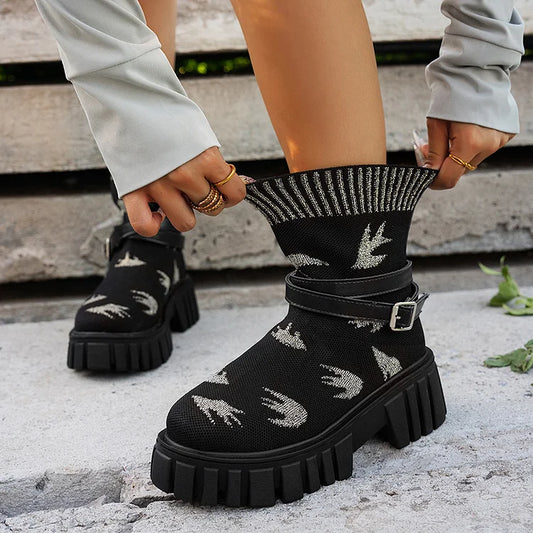 Muster-Druck-Riemenschnallen-Dekor, runde Zehenpartie, klobiger Absatz, mittelhohe Stiefel
