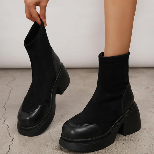 Patchwork-Pullover-Stiefel mit runder Zehenpartie und klobigem Absatz