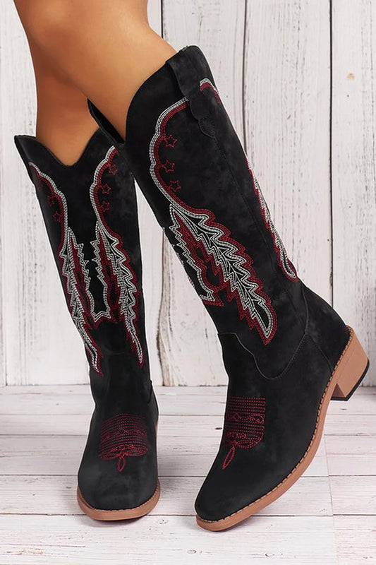 Kniehohe Stiefel mit Stickerei, Patchwork, klobigem Absatz und eckiger Zehenpartie