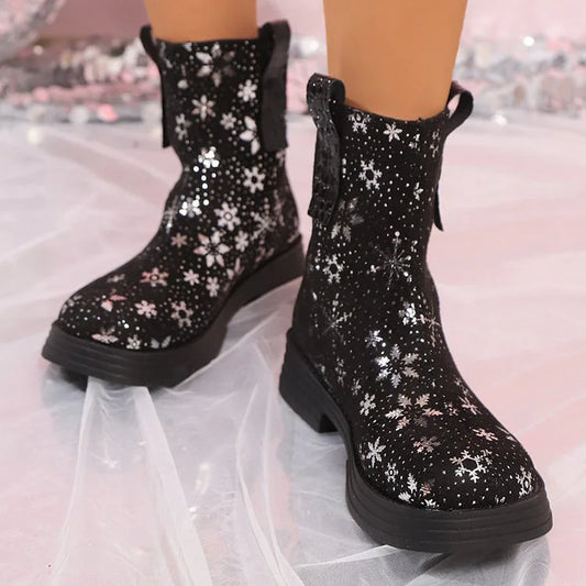 Halbhohe Stiefel mit rundem Zehenbereich und Reißverschluss mit Schneeflockenmuster und niedrigem Blockabsatz