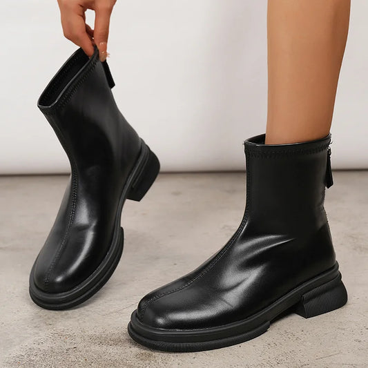 Mittelhohe Stiefel mit einfarbigem Reißverschluss und runder Zehenpartie und klobigem Absatz mit Nahtdetail
