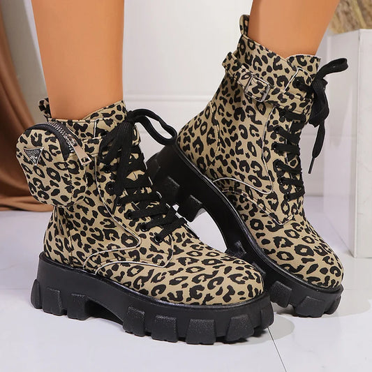 Mittlere Schnürstiefel mit Leopardenmuster und runder Zehenpartie mit Taschendekor und klobigem Absatz