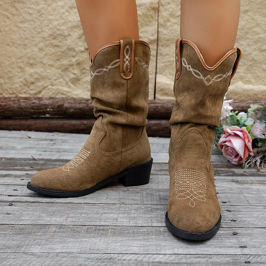 Patchwork-Stiefel mit runder Zehenpartie und Stickerei mit klobigem Absatz und mittelhoher Wade