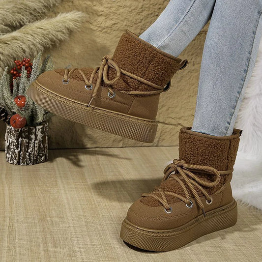 Patchwork-Schneestiefel mit runder Spitze und niedriger Plateausohle zum Schnüren