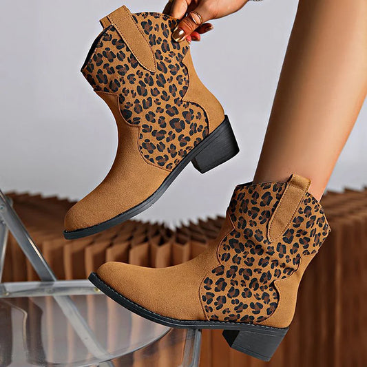 Patchwork-Leopardenmuster-Stiefeletten mit klobigem Absatz und runder Zehenpartie