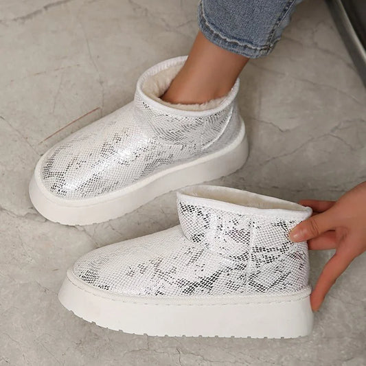 Niedrige Plateau-Schneestiefel mit Schlangenmuster und runder Zehenpartie und Kunstpelzfutter