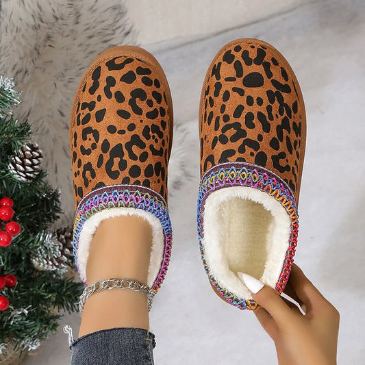 Mit Fleece gefütterte, mehrfarbige Besatz-Schneestiefel mit runder Zehenpartie und Leopardenmuster