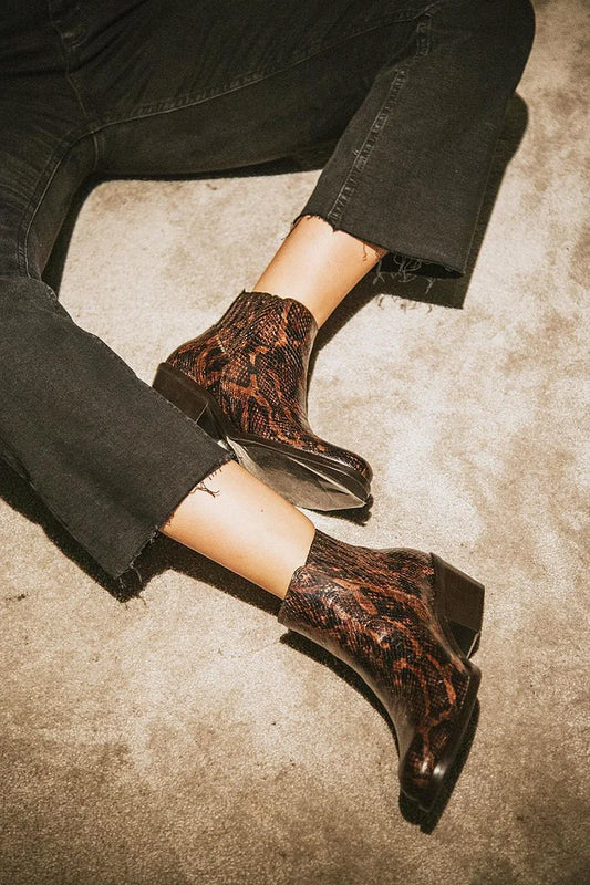 Braune Stiefeletten mit Schlangenmuster und runder Zehenpartie und klobigem Absatz [Pre Order]
