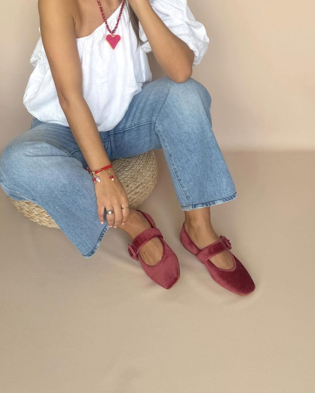 Bordeauxroter Samt Mary Jane Ballerinas mit breiter Schnalle und quadratischer Spitze [Vorbestellung]