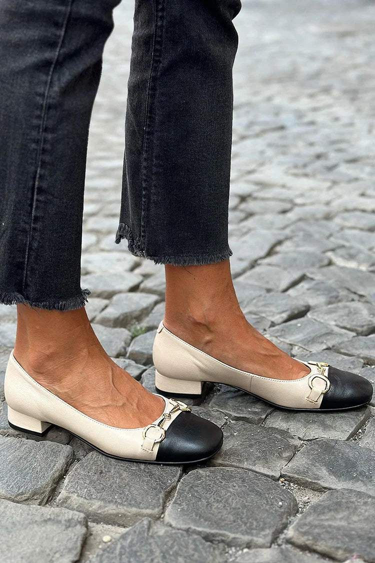 Farbblock Schnallen Dekor Quadrat Zehen Beige Niedrige Absätze