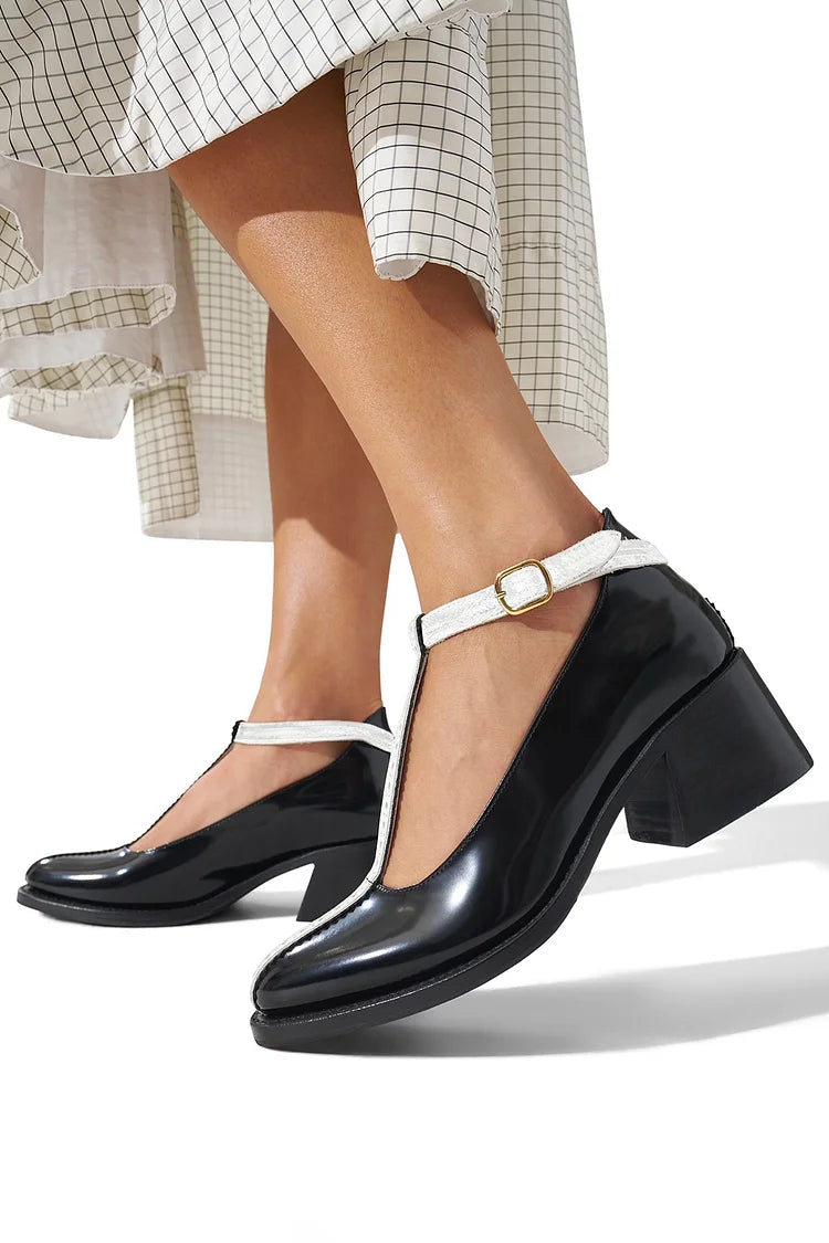 Farbblock T-Riemen Schnalle Runde Zehe Schwarze Niedrige Absätze [Vorbestellung]