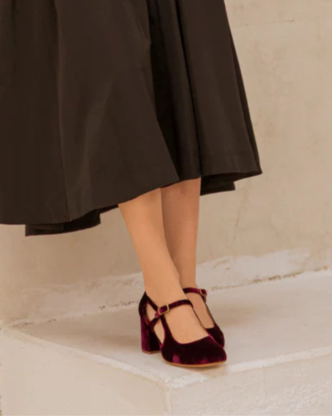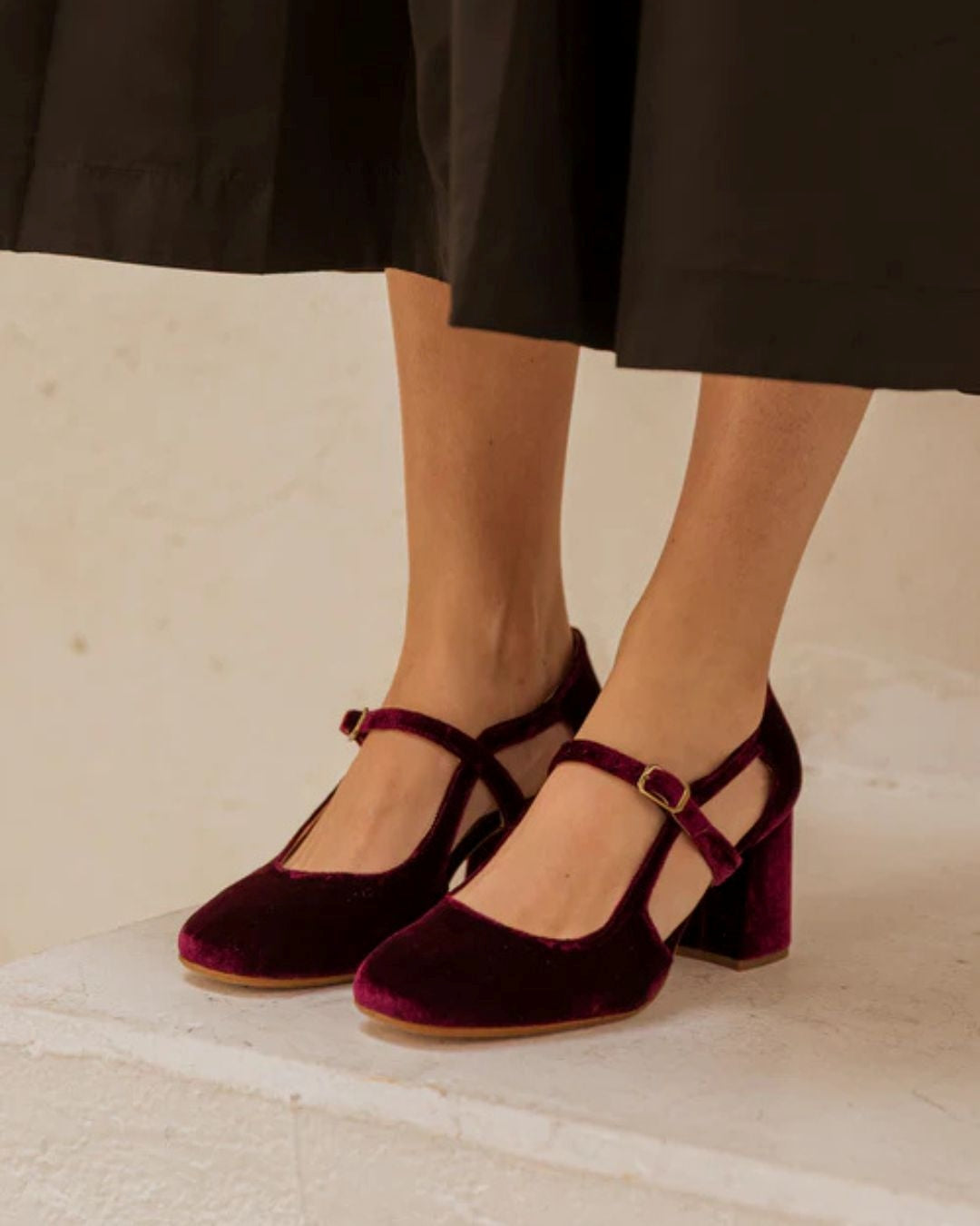 Elegante burgunderrote Samt-Sandaletten mit Knöchelriemen, Cutout und Blockabsatz [Vorbestellung]