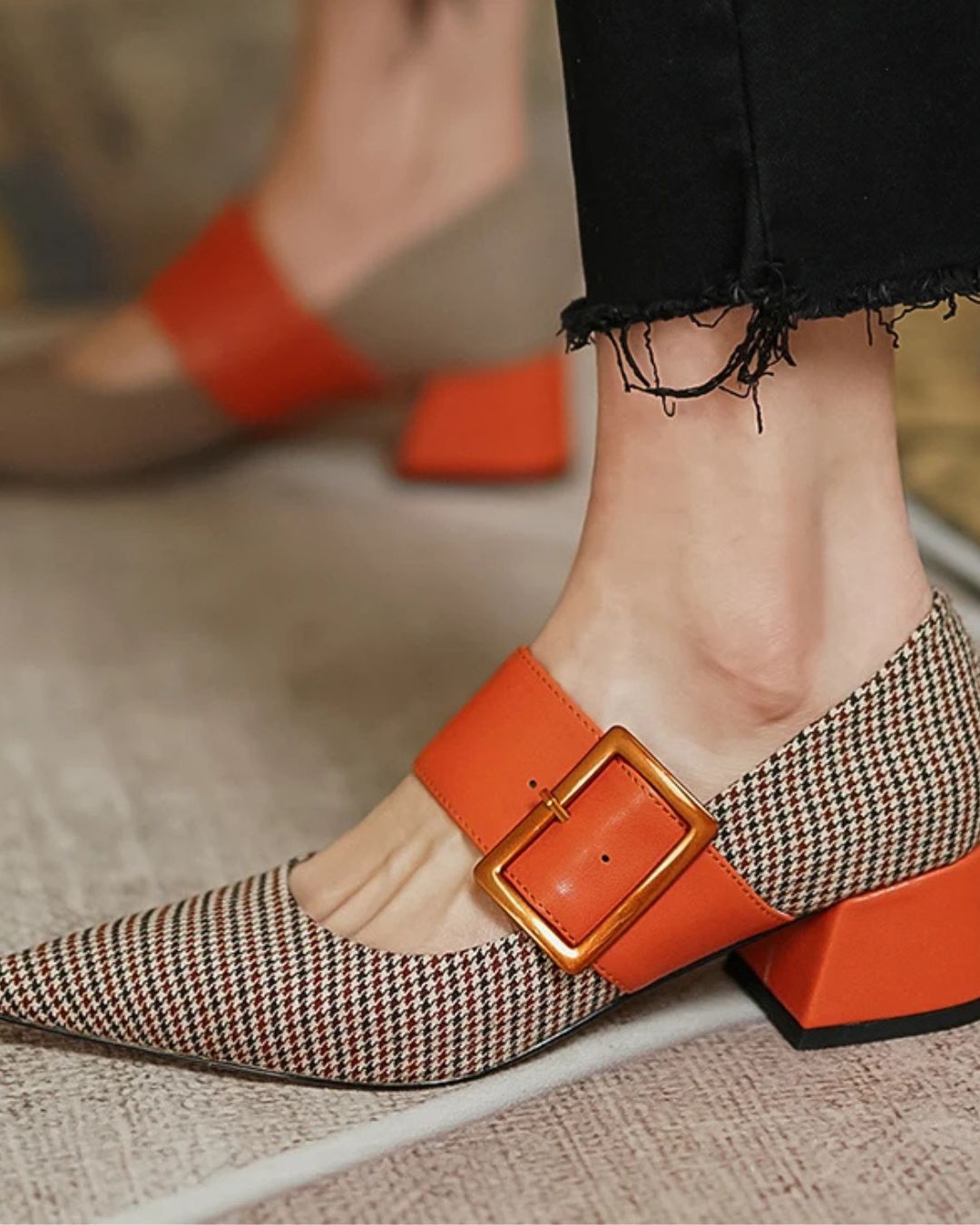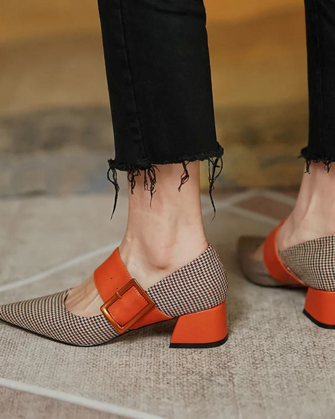 Hahnentritt Patchwork Spitz zulaufende Zehe Breite Schnalle Blockabsätze [Vorbestellung]
