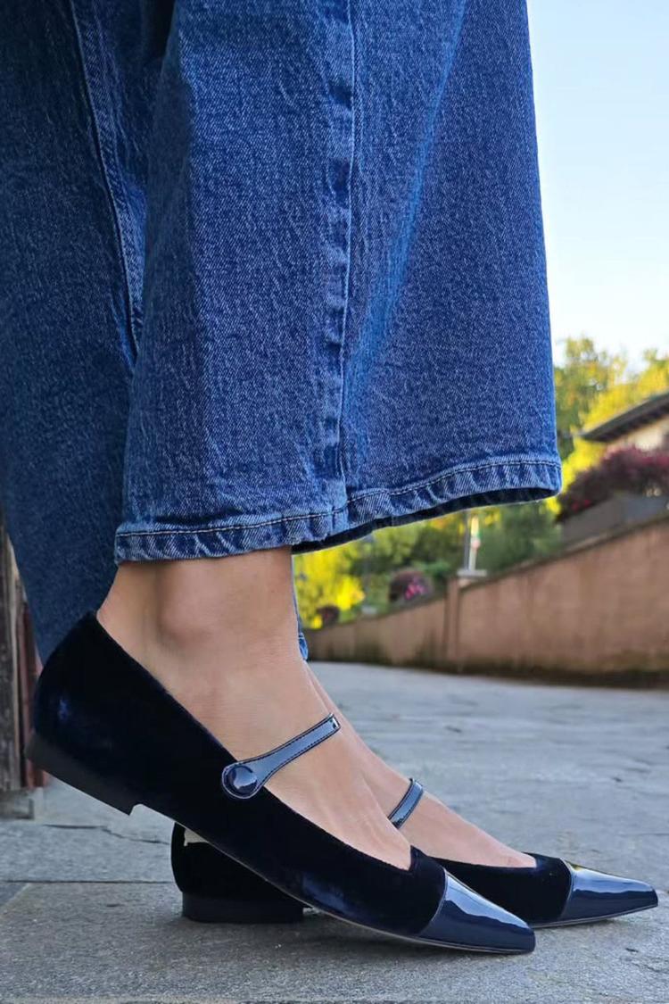 Instep-Riemen Samt Patchwork Spitz zulaufende Zehe Navy Ballerinas [Vorbestellung]